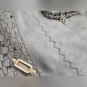Sophisticated boho bag. Stylish with gray body and black accents.Elevate your style with this chic gray and black fringe bag. Perfect for any occasion, this bag combines elegance with a touch of bohemian flair. Interior Suede still in good condition some wear on exterior over time but overall still in good condition. No dust bag. Interior material Suede, Length 39cm, Width 2.5cm, Height 38cm, Handle drop 19cm, gold tone hardware, exterior material leather & python.