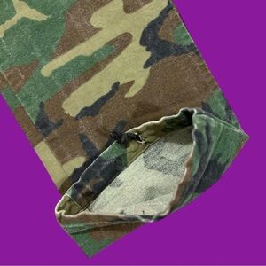 woodland camo, cargo pockets, drawstring cuffs, rugged cotton, outdoor wear, military style, preworn, tactical, utilitarian, preserved condition
