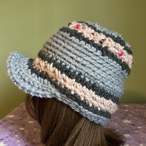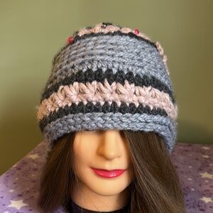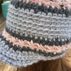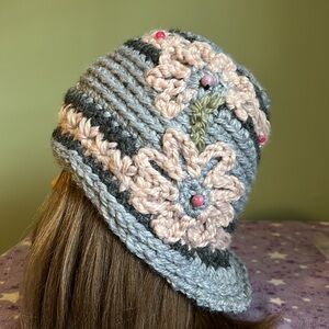 Elevate your style with this handcrafted knit hat featuring charming floral accents. The soft light silver and blue changing colors depending on the light available and rose colors add a touch of elegance to any outfit. Warmest winter hat clean never worn new wash suggestion in tied pantyhose sock or cloth laundry bag to prevent piling fuzz and maintain form and beauty.