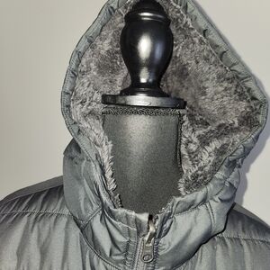Warm and stylish puffer jacket. Features a cozy fur lined hood. Ideal for cold weather. there is no size tag on this particular.Item so I will add the measurements. i believe it would be equivalent to a man's small.