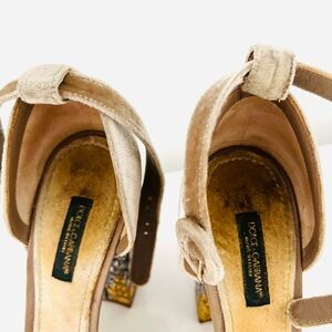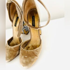 Extremely rare Dolce & Gabbana Byzantine Runway pumps in beige soft velvet with exquisite cross pattern designed heels made out of metallic gold & silver sequins and large red stone cross center embellished heels. Wrap ankle strap w/ velvet covered buckle. Very luxe details! Can be worn day to evening. Size 37. Worn twice & have a tiny black spot on one pump front as shown in photo but not noticeable and in great condition overall. Ornate Heels are like new without any flaws. Inner soles show a bit of wear as shown. Made in Italy. Very Few pairs were made. Purchased in Milan for $1995. Model photo wearing same style but not same stone design on heels.