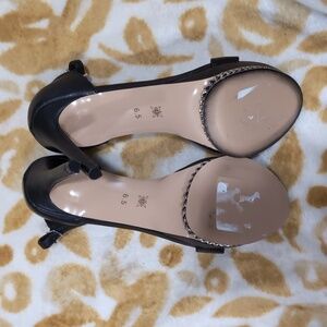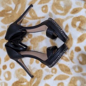 These elegant black strappy 4" heels feature a high thin heel and an open toe design. The smooth straps include a delicate ankle strap for added support, making them perfect for a sophisticated look. pre loved ..... D
