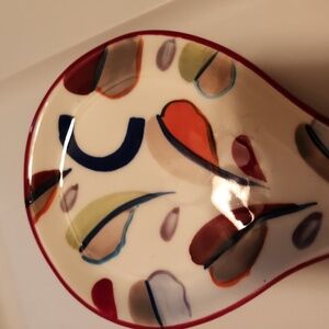 Brighten up your kitchen with this colorful ceramic spoon rest. Featuring a vibrant mix of red, blue, and green hues, it's both functional and stylish.
