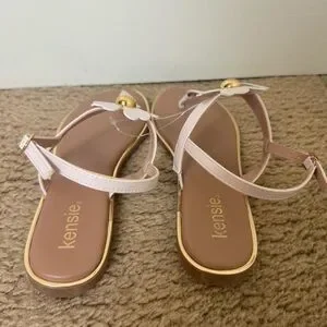 Chic pink sandals by Kensie. Features gold floral accents. Perfect for casual outings.