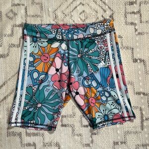 Floral patterned shorts with Adidas logo. Features multicolor design with teal, pink, and orange accents.