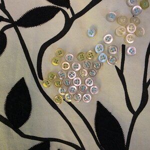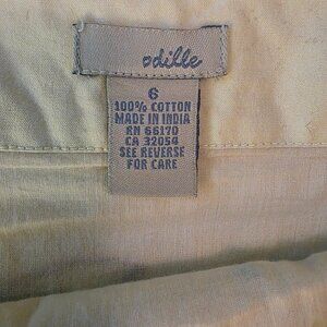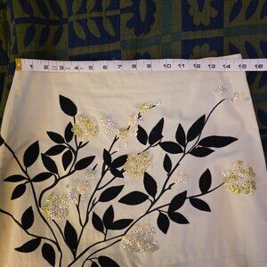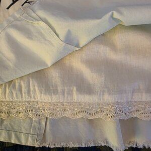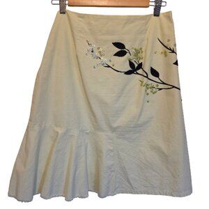 This is an exquisite skirt from Anthropologie by Odille. It is 100% cotton and has an A-line silhouette with embroidered leaves and a floral button detail. There is a side zipper with hook and eye closure. The cotton lining has a beautiful lace trim. A really cool feature of this skirt is that it has a ruffled section created by a vertical seam, resulting in a slightly asymmetric hemline. The very edge of this hem is unfinished, appearing frayed and raw. The color is a very, very pale yellow.
