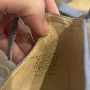Chic light blue suede heels with ankle strap. Stylish block heel design. Ideal for versatile wear.