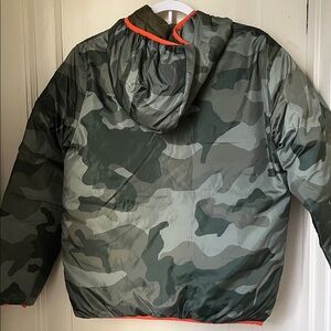 Durable camouflage puffer with striking orange trim. Ideal for outdoor play.