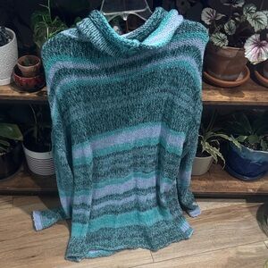 Chic cowl neck sweater with teal and gray stripes. Perfect for layering and staying warm.