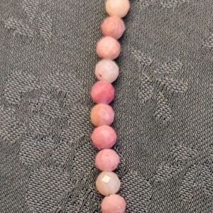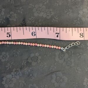 Delicate bracelet featuring beautiful thulite beads. Perfect for adding a touch of color to any outfit. Right about 7 inches with about 1 inch extension. The beads are small, hopefully you can tell the size in the last few pictures while being measured with a normal size measuring tape. I will try to have better pictures that show the size soon. They are bigger than sead beads but I am worried my pictures I have to show the detail mine be misleading. Please look at last pics.