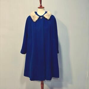 Vintage 50's Blue Fur Collar Wool Swing Coat Winter Heavy A-line pockets, Women's Size M
