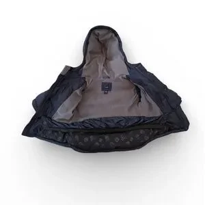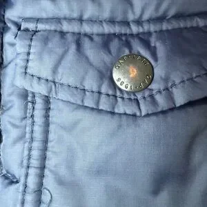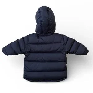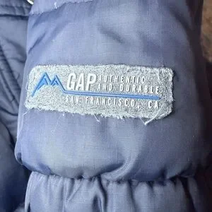 GAP Toddler Down Puffer Coat in navy. Size 12-18 months. Cozy fleece lining. Elastic with snaps to cinch around waist. Zip and snap closure. Hood. Some wear on snaps and arm badge; pictured. Excellent condition. Non smoking home.