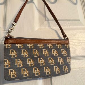 Chic wristlet with iconic monogram pattern. Features brown leather trim and strap.
