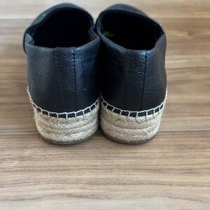 Elegant black espadrilles with tan accents. Features iconic MK logo. Stylish and versatile.