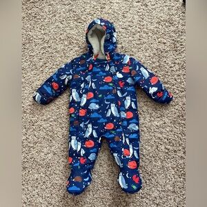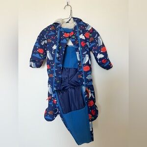 Features: The snowsuit is fleece-lined, hooded, and fold-over hand covers/mittens for extra warmth. It features double zips down the front for easy dressing.