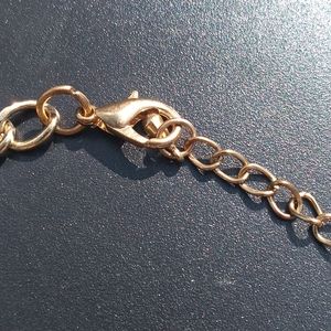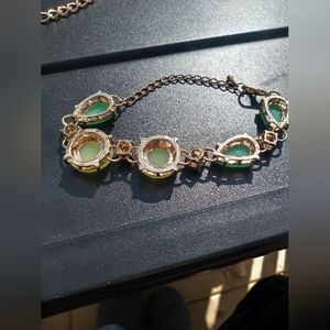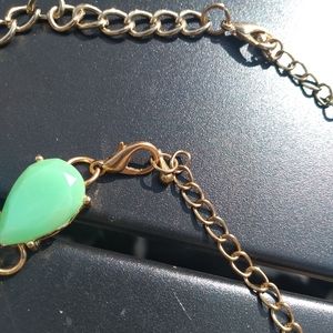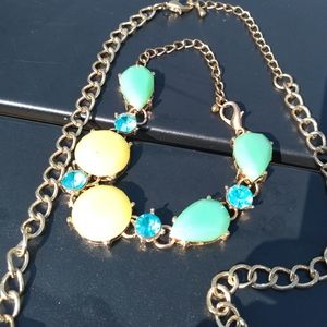 A bright and fun green and turquoise dangling statement necklace with a matching bracelet. Gold coloured chain. Excellent condition.