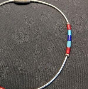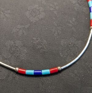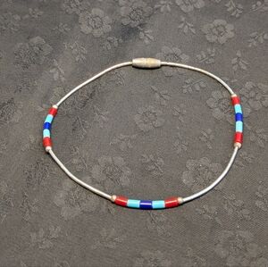 This vibrant bracelet features a mix of red, blue, and liquid silver beads, perfect for adding a pop of color to any outfit. About 7 inches. I know the silver beads are sterling silver but I am not sure the colored beads are stone, I am assuming they are turquoise, coral and lapis.