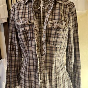 Chic plaid design with button-down front. Features dual chest pockets. Perfect for versatile styling. Get your western vibe on 🐴. This is super cute !