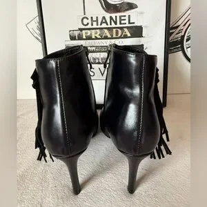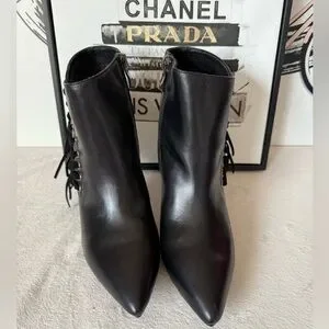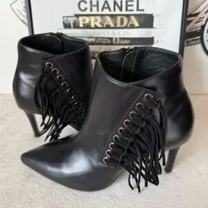 New Black Leather Fringe Pointed Toe Stiletto Heel Boots with Zipper