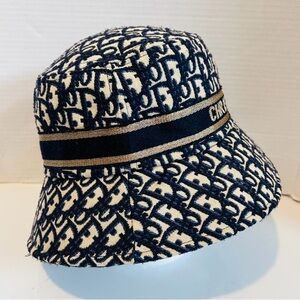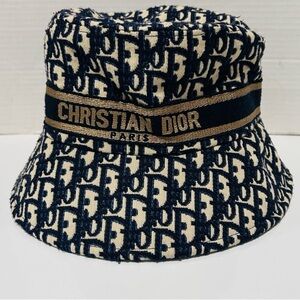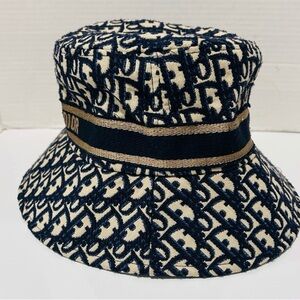 Stylish Dior bucket hat with iconic monogram. Features navy and beige colors. Perfect for a chic look,