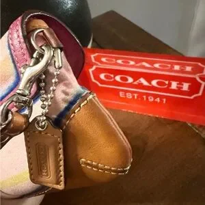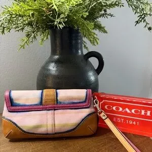 This rare Y2K Coach Striped Soho wristlet is crafted in a soft canvas fabric with leather trimming. The interior is lined in a light brown fabric. Whether you choose to toss it in your bag to hold your smaller essentials or carry it as a wristlet, it’s a beautiful piece!