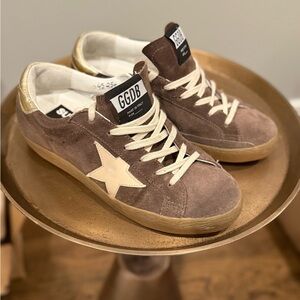 Stylish Golden Goose sneakers. Brown suede with gold accents. Iconic star design. Comfortable and trendy.
