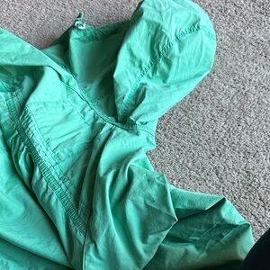 Mint green utility jacket with adjustable hood. Ideal for outdoor adventures. Lightweight and practical.