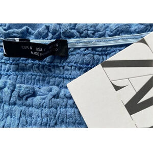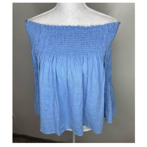 NWT Zara Off Shoulder Linen Top Light Blue Smocked Bell Sleeve Size S