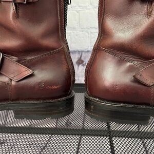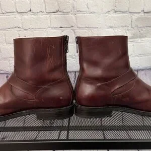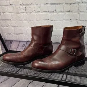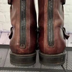 Frye men’s leather boots. Zips up from the back. There is a buckle on the top outside of the boot with 3 holes to allow for an adjustment.