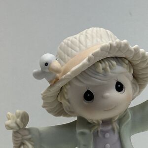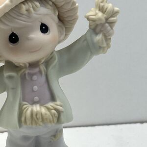 This vintage Precious Moments figurine by artist Sam Butcher features a cute scarecrow character with the inscription "You're Just Too Sweet To Be Scary." The figurine stands at 6.25 inches tall and comes in its original box, making it a perfect addition to any Halloween or fall-themed decor collection. Made of porcelain and featuring a matte finish, this collectible from 1997 showcases American style and is a charming piece for teens, boys, and girls alike. The figurine is a part of the Precious Moments collection and is a delightful representation of the Halloween theme.