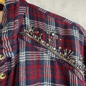 Free People Downtown Romance Embellished Plaid Shirt Red Navy Blue Beaded Boho M