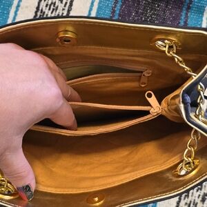 Elevate any evening look with this charming, vintage-inspired shoulder bag. Crafted in a soft, blue and champagne gold fabric. It has a double chain strap, perfect for wearing over your shoulder or as a handbag. This piece is ideal for weddings, formals, parties, or adding a feminine touch to a casual outfit.