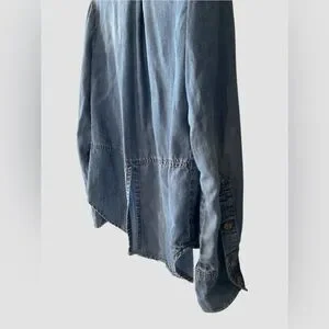Cloth & Stone Anthropologie Chambray Tencel Denim Shirt Long Sleeves with Button Cuffs roll tab Collared V Neck Hidden button placket High low hem Split tail back for comfy fit Soft and flowy chambray shirt Front patch pockets.