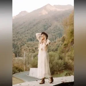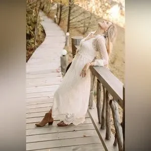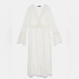 Chic cream maxi dress with lace details. Features long sleeves and a flowing silhouette. Ideal for elegant occasions or weddings.