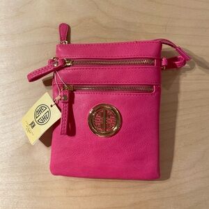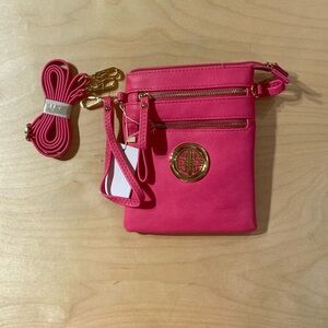 Stylish pink crossbody bag with gold accents. Perfect for everyday use.