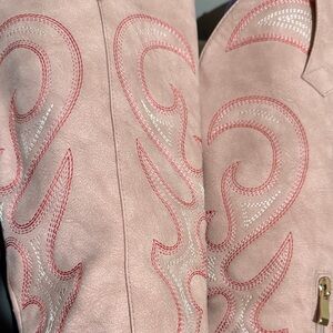 Step out in style with these elegant pink knee high heeled boots, made of vegan leather, featuring intricate embroidery. Perfect for adding a touch of sophistication to any outfit.