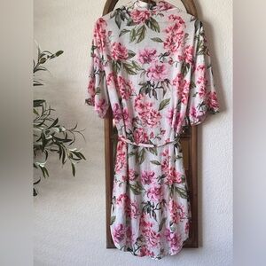 Gorgeous and flowy Show Me Your Mumu Brie kimono robe in a romantic pink floral print. Lightweight and versatile—wear it as a swim cover-up, getting-ready bridal robe, or styled over denim and a tank for an effortless boho look. Features a waist tie belt, kimono sleeves, and a relaxed drape.