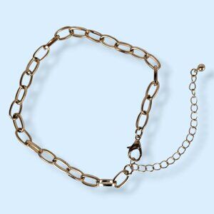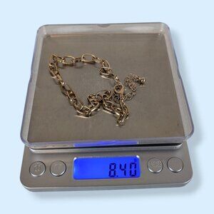 This anklet (or long bracelet) is made of a gold tone metal and has an adjustable lobster clasp closure. The chain is made up of medium sized round oval links. While this could be worn as a bracelet (and though it is photographed on a wrist), the length of the piece puts it in the "anklet" category. There is normal wear, but the length is the only thing that may affect wearability for you. I've listed it in the bracelet category because there's no anklet category.