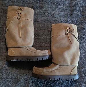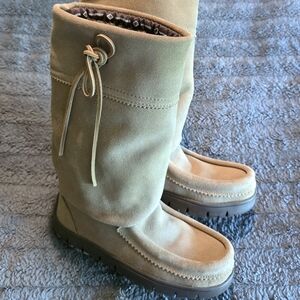 Lovely suede Manitobah hunter boots in their new Two Rivers sole design. Soft and cozy on the inside with a sheepskin shearling footbed lining. Only worn twice. Fits true to size but please note that similar to many of Manitobah's boots, these do have a slimmer fit. Ideal for those with a narrow foot, would not be ideal for those with a wider foot.
