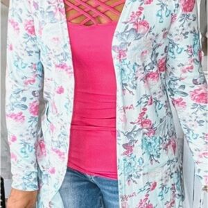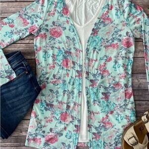 Beautiful Michelle Mae floral cardigan in a soft mint background with pink and blue flower detailing. This lightweight knit layering piece is perfect for spring, summer, and early fall. Super comfortable, flattering, and easy to style with jeans, leggings, tees, or tanks.