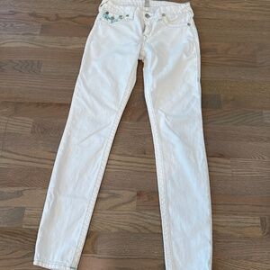 Very Unique Miss Me Off White/teal jeans size 28. These lovely jeans have been gently worn and adored. Unfortunately, I have grown too old to pull them off any longer lol. They are heavier jean in a light cream color with teal accents. They are also straight leg jeans.