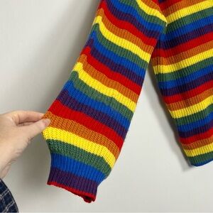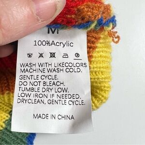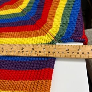 Vibrant sweater with red, yellow, blue, and green stripes. Perfect for adding color to your wardrobe. 100% Acrylic