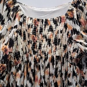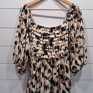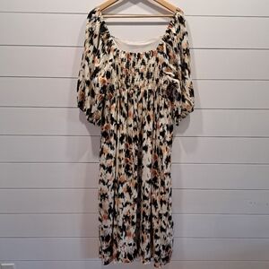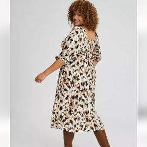 This midi-length plus-sized Torrid dress features a striking multicolor abstract pattern, a pintucked bodice, 3/4 length puff peasant sleeves, and hidden seam pockets. It also has a smocked back panel that allows for stretch to accomplish the perfect fit. The dress combines style and comfort, making it a versatile addition to your wardrobe. Style it to achieve the perfect feminine, cottagecore, bohemian, romantic, indie, urban, coastal cowgirl, or artsy aesthetics. Torrid size 2, 2X, 18-20.