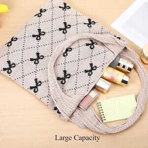 Features: This adorable crochet tote features a cute pink bow on a soft cream background, adding a touch of charm to any casual look. It's spacious enough to hold everything from books to groceries, making it perfect for shopping, traveling, or beach trips. The wide, soft shoulder straps make it so comfy to carry all day long. Quality-wise, it's crafted from durable, lightweight polyester with a flat knitting process—soft, sturdy, and designed to last.