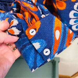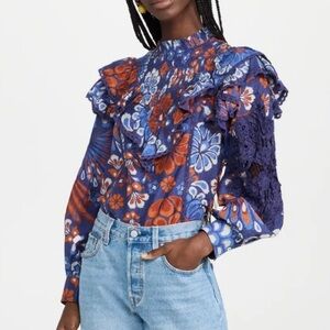Vibrant ruffle smocked top with embroidery on sleeves. EUC. Size small measures shoulder to hem 21”, armpit to armpit 17”, waist 18”