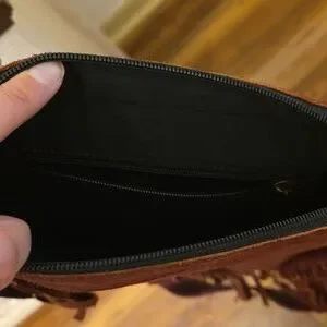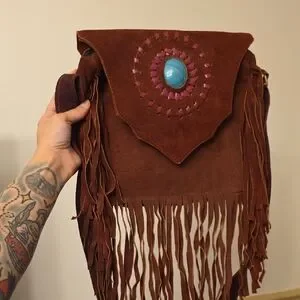 Warm Brown Fringe Leather Bag with Turquoise Accent