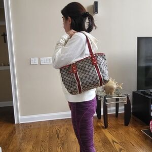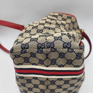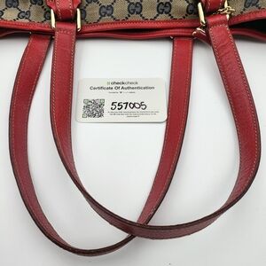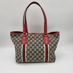 Elevate your style with this Gucci tote bag. Featuring a chic red and tan design, this bag is perfect for any occasion. Crafted with attention to detail, it offers both elegance and functionality.