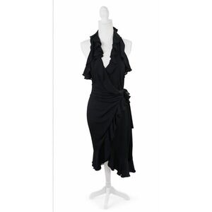 Elegant and flattering Anthropology halter midi dress featuring cascading ruffle details and feminine asymmetrical rap silhouette. Designed with a plunging V neck halter neckline, open back, and a self tie waist that cinches beautifully for a custom fit. The flowy fabric breaks effortlessly and finishes with a soft ruffled hem, making this dress perfect for weddings, cocktail parties, date nights, or special occasions. A timeless black dress with romantic movement and a chic, elevated feel.