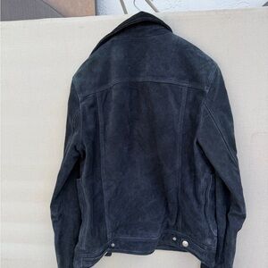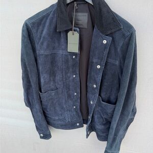 Stylish suede jacket by All Saints. Features a button-up front and dual pockets. Perfect for layering.