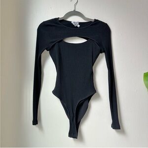 Stylish black bodysuit with cutout design. Long sleeves. Perfect for a chic look.